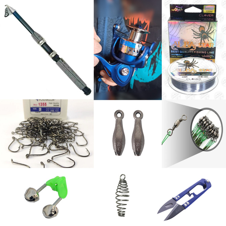 ست لوازم ماهیگیری چوب فایو استار سایز 3.60 و چرخ سیل استار 7000 به همراه 100 متر نخ باکیفیت، 20 عدد قلاب، 2 عدد سرب، فنر فیدر، زنگوله و قیچی.