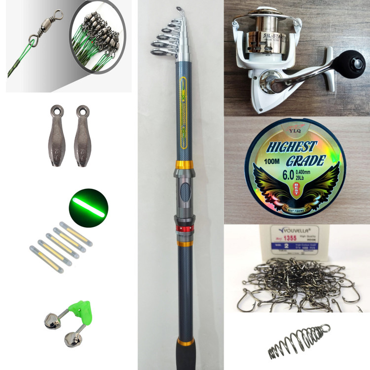 ست لوازم ماهیگیری چوب کپوری گوانگوی سایز 4.50 و چرخ سیل استار 7000 دستگیره تمام فلزی به همراه ست کامل وسایل شامل نخ، قلاب، سرب، هرزگرد، زنگوله، فنرفیدر، فسفر و شناور.
