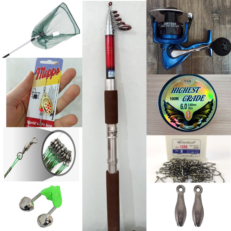 ست لوازم ماهیگیری چوب مروارید قرمز اصل 3 متری و چرخ جی دبلیو 7000 دستگیره فلزی به همراه نخ، قلاب، سرب، لانسه قزلی، سیم بکسل و هرزگرد، زنگوله و چاک دهانه بزرگ دو متری مناسب صید انواع ماهیان سبک و سنگین در سد، رودخانه و دریا.